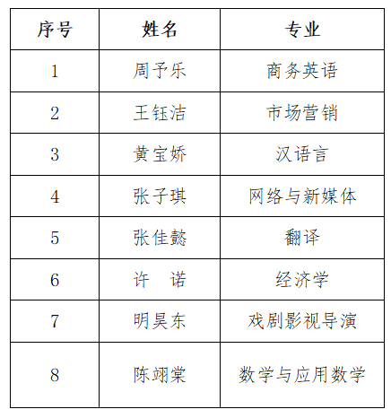 根据《关于遴选“2024年度优衣库奖学金”项目人选的通知》的相关要求,经学生申请、院系推荐、专家面试评审、学校审核,拟确定下列8名学生为我校2024年度“优衣库奖学金”推荐对象,现予以公示。