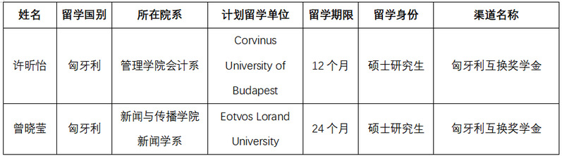 根据国家留学基金管理委员会《关于启动2026/2027年度匈牙利互换奖学金(学位生)项目遴选工作的通知》,我校遵循“公开、公平、公正”原则,积极组织申报工作。经学生自愿申请、项目具体实施单位初审、学校审核,现将人员申报拟推荐结果公示如下: