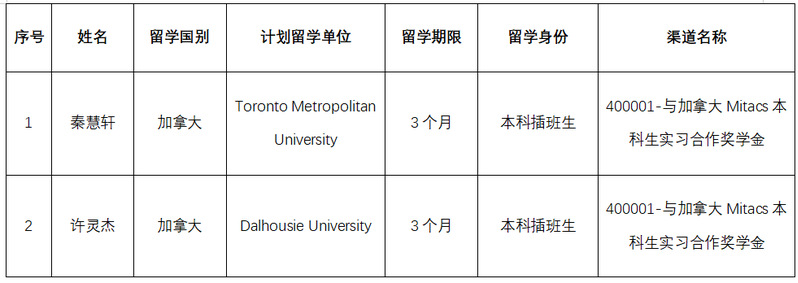 根据国家留学基金管理委员会关于《2026年加拿大Mitacs本科生实习合作奖学金遴选通知》,我校遵循“公开、公平、公正”原则,积极组织申报工作。经学生自愿申请、学校审核,现将人员申报拟推荐结果公示如下: